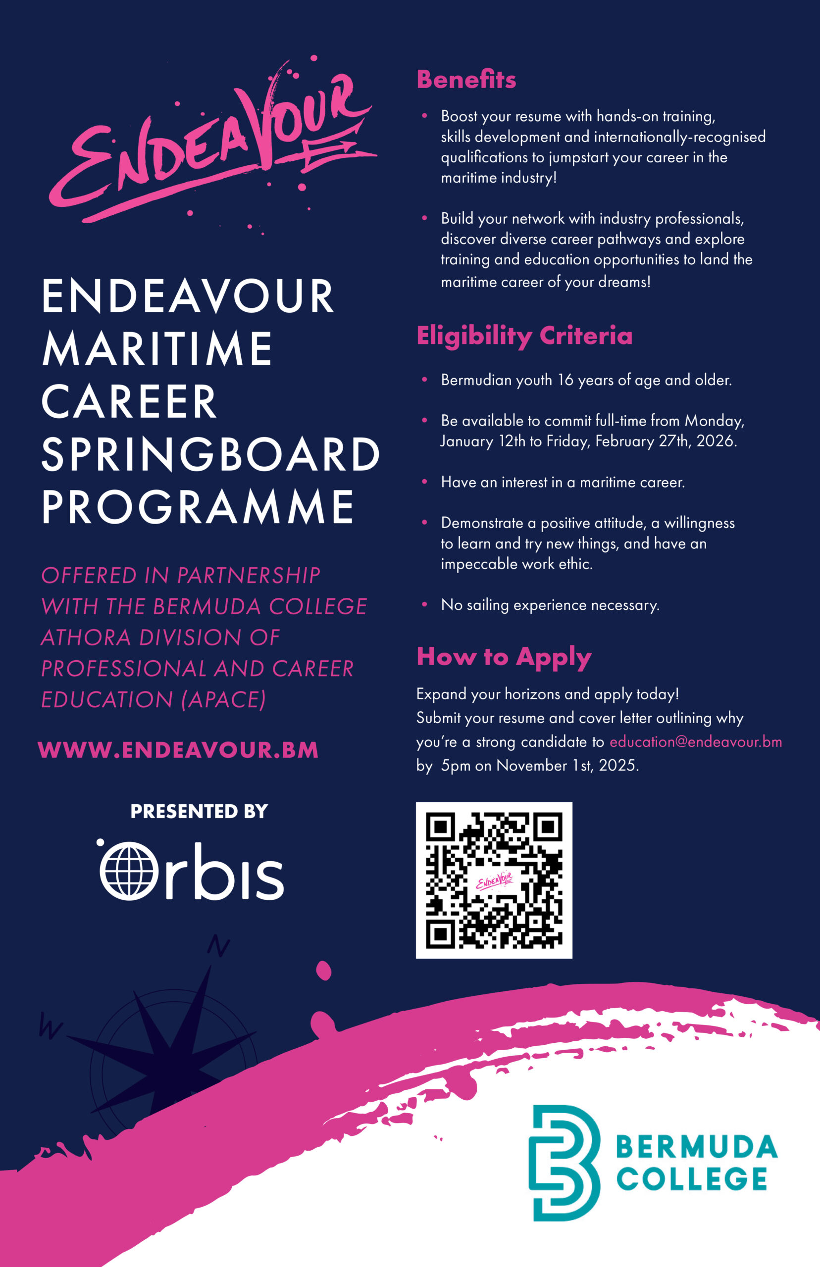 The Endeavour Maritime Career Springboard Programme is a 7-week maritime training and career development initiative for Bermudian youth ages 16 and older who are seeking employment and interested in a maritime career. Offered in partnership with the Bermuda College Athora Division of Professional and Career Education (APACE).